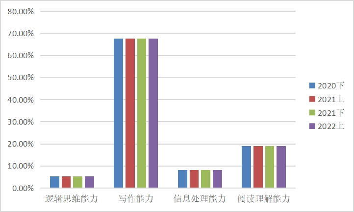 基本能力模塊作為最后一個模塊,主要考查考生的信息處理能力、邏輯思維能力、閱讀理解能力和寫作能力這四個方面的能力。題型覆蓋單選題、材料分析題和寫作題三種題型。從最近試題來看,一般為3道信息處理單選、2道邏輯思維能力單選、1道14分的閱讀理解題和1道50分的寫作題??梢?,這一模塊具有題量小、分值高的特點。