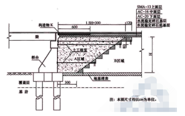 某施工單位承接了一條二級公路的施工,路線全長 30.85km,路基寬度為 8.5m,路面寬度為 2× 3.5m。該工程內(nèi)容包括路基,橋梁及路面工程等。為減少橋頭不均勻沉降,設(shè)置橋頭跳車,橋臺與路堤交接處按圖施工,主要施工內(nèi)容包括:地基清表、挖臺階、A 區(qū)域分層填筑、鋪設(shè)土工格柵、設(shè)置構(gòu)造物 K、路面鋪筑等。路面結(jié)構(gòu)層如圖所示,B 區(qū)域為已經(jīng)填筑完成的路堤填筑區(qū)域。