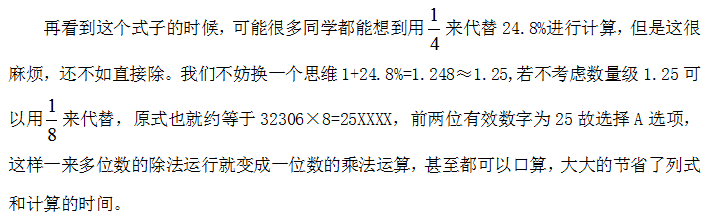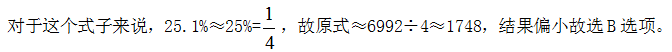 例2中四個(gè)選項(xiàng)數(shù)量級(jí)一致,所以我們只要計(jì)算出相近的有效數(shù)字即可,不用考慮小數(shù)點(diǎn)的問題,所以認(rèn)為的把25.1用25.1%來代替也不會(huì)影響結(jié)果的有效數(shù)字是多少,故原式可用6992÷4代替計(jì)算,結(jié)果為1748,和B選項(xiàng)前幾位有效數(shù)字最為接近,故選擇B。