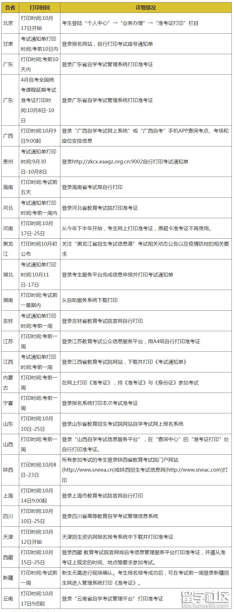 2022年10月全國各地自考準考證打印時間