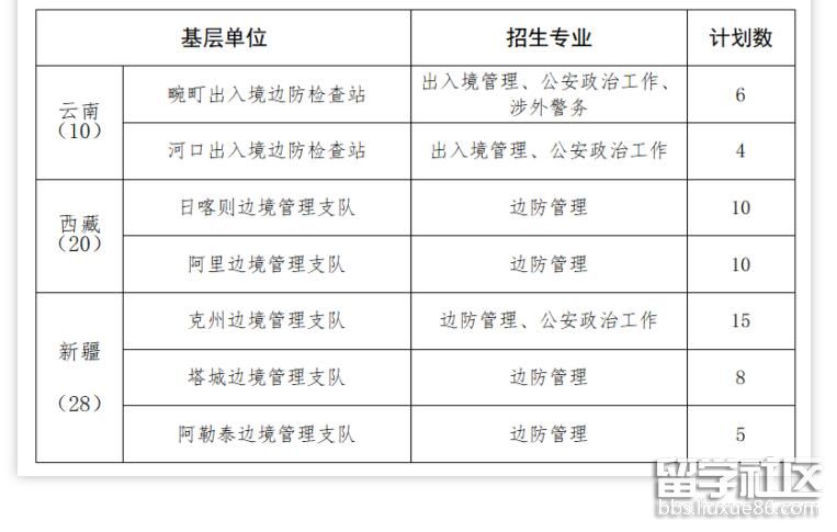 公安專業(yè)招生計(jì)劃中包含定向艱苦邊遠(yuǎn)地區(qū)移民管理機(jī)構(gòu)基層單位工作計(jì)劃58人(詳見(jiàn)附表),其中:云南10人、西藏20人、新疆28人。由于公安工作高負(fù)荷、高對(duì)抗、高壓力、高風(fēng)險(xiǎn)等特點(diǎn)和人民警察職業(yè)的特殊要求,公安專業(yè)女生計(jì)劃數(shù)不超過(guò)招生計(jì)劃總數(shù)的15%。