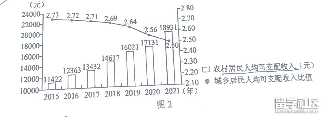 13. 圖2反映2015-2021年我國農(nóng)村居民人均可支配收入變化情況、城鄉(xiāng)居民人均可支配收入比值變化情況。