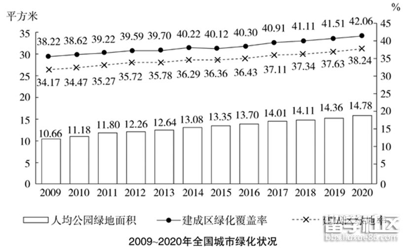 B.以2009年為基期計(jì)算,2009—2020年城市建成區(qū)綠地率年均上升0.4個(gè)百分點(diǎn)以上