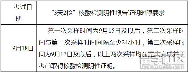 二、考試當日,所有考生須持本人考試當天前3天內(nèi)2次(以采樣時間為準,2次采樣時間間隔至少24小時,最后1次采樣時間須在首場考試當天前24小時內(nèi))重慶市內(nèi)核酸檢測陰性報告證明(紙質(zhì)和電子均可,下同),且“渝康碼”、“通信大數(shù)據(jù)行程卡”顯示為綠碼(當日更新),體溫查驗<37.3℃且無其他異常情況的,方可進入考點參加考試。