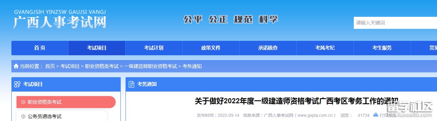 根據(jù)《人力資源和社會(huì)保障部人事考試中心關(guān)于2022年度一級(jí)建造師資格考試考務(wù)工作的通知》(人考中心函〔2022〕57號(hào))精神,為做好2022年度一級(jí)建造師資格考試廣西考區(qū)考務(wù)工作,現(xiàn)將有關(guān)事項(xiàng)通知如下: