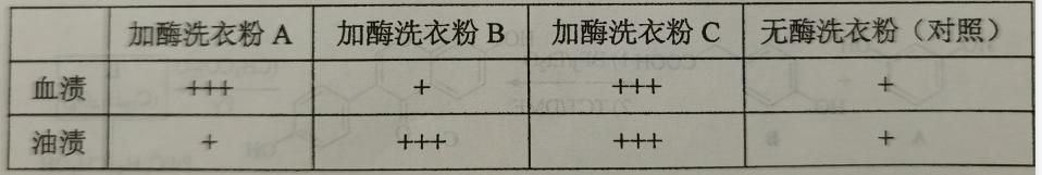 加酶洗衣粉是指含有酶制劑的洗衣粉。某同學(xué)通過實驗比較了幾種洗衣粉的去漬效果(“+”越多表示去漬效果越好),實驗結(jié)果見下表。
