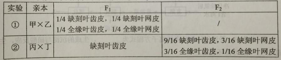 植物的性狀有的由1對基因控制,有的由多對基因控制。一種二倍體甜瓜的葉形有缺刻葉和全緣葉,果皮有齒皮和網(wǎng)皮。為了研究葉形和果皮這兩個性狀的遺傳特點,某小組用基因型不同的甲乙丙丁4種甜瓜種子進(jìn)行實驗,其中甲和丙種植后均表現(xiàn)為缺刻葉網(wǎng)皮。雜交實驗及結(jié)果見下表(實驗②中F1自交得F2)。