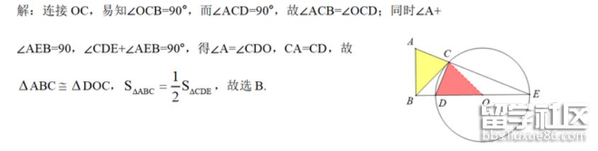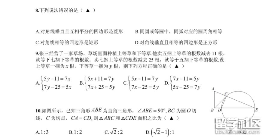 10.已知三角形ABE為直角三角形,∠ABE=90°,BC為圓的切線,C為切點(diǎn),CA=CD,則ABC和CDE面積之比為( )