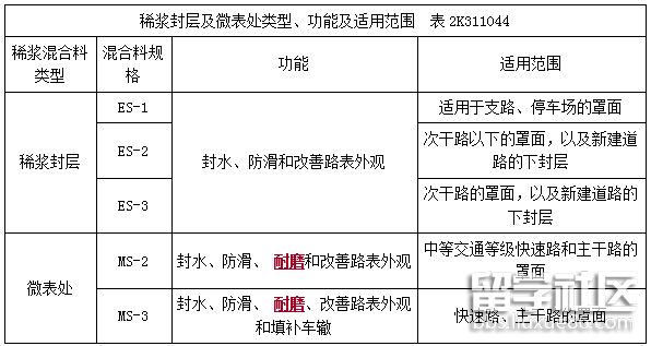 稀漿封層混合料按礦料級(jí)配的不同,可分為細(xì)封層、中封層和粗封層,分別以ES-1、ES-2、ES-3表示;微表處混合料按礦料級(jí)配的不同,可分為Ⅱ型和Ⅲ型,分別以MS-2和MS-3表示。稀漿封層及微表處類型、功能及適用范圍應(yīng)符合表2K311044的規(guī)定。