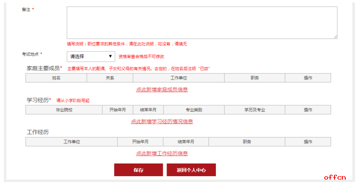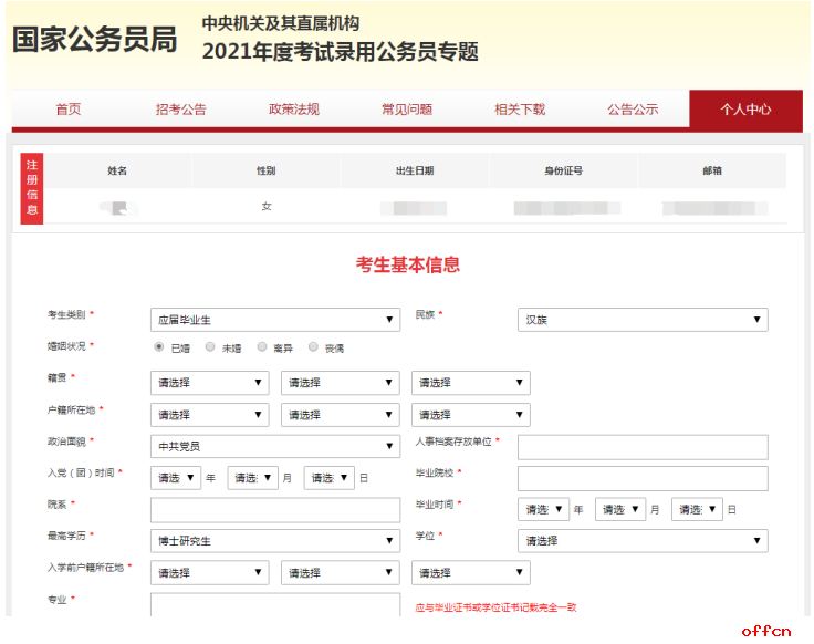 提醒考生,點擊“完善個人信息”之后就要進入全面填寫信息頁面,考生們此時可將相關(guān)的證件準備出來,以便填寫時準確輸入信息,頁面詳情如下: