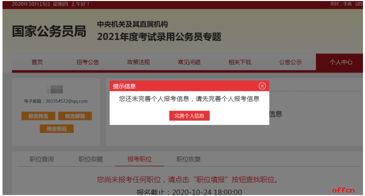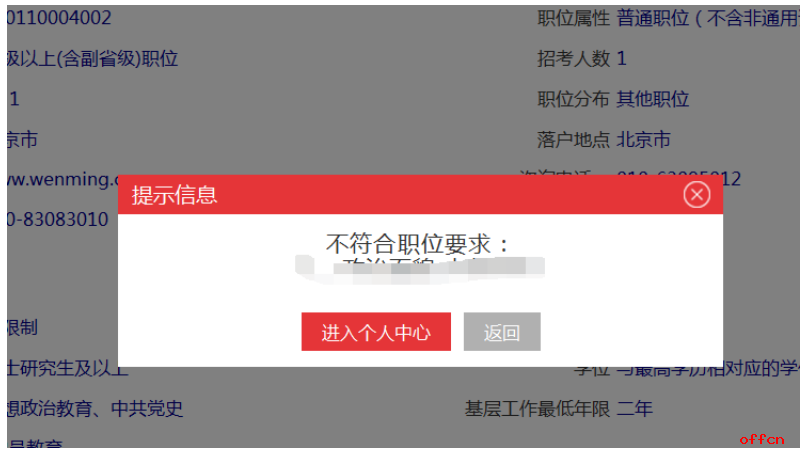 (1)如果個人信息與招錄職位要求不符合會彈出不符要求的相關(guān)提示,這種情況下就需要重新填寫個人信息然后再提交。