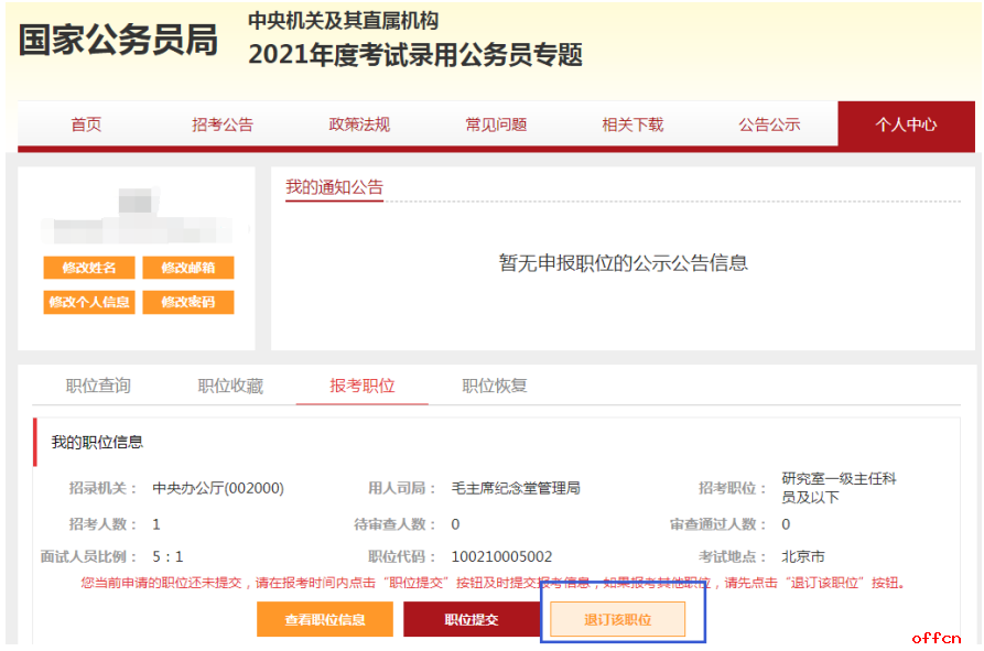 提交之后等待審核結(jié)果,如果心生悔意,可點擊“退訂改職位”取消,然后重新選擇新職位。剛開始會顯示“待審核”,考生可以隨時進入“個人中心”去查看審查結(jié)果。