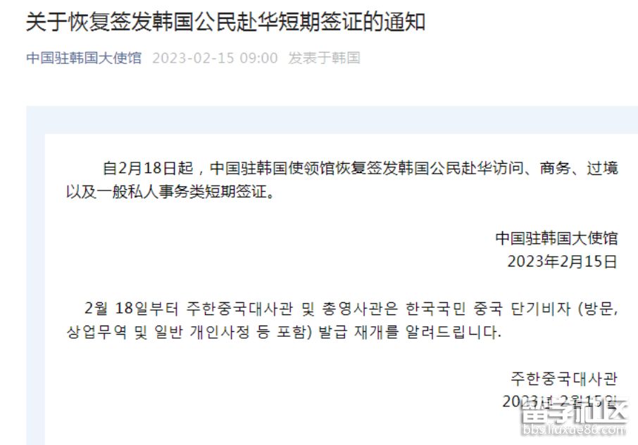 據(jù)中國(guó)駐韓國(guó)大使館消息,自2月18日起,中國(guó)駐韓國(guó)使領(lǐng)館恢復(fù)簽發(fā)韓國(guó)公民赴華訪問(wèn)、商務(wù)、過(guò)境以及一般私人事務(wù)類短期簽證。
