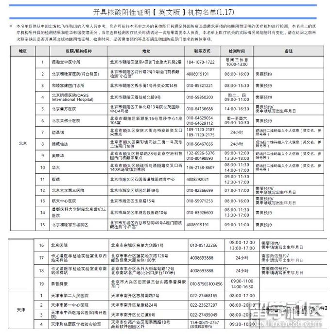 以下是韓國(guó)大使館發(fā)布的北京、天津地區(qū)的可出具韓國(guó)認(rèn)可核酸檢測(cè)報(bào)告證明的機(jī)構(gòu)列表,僅供大家參考,建議前往前務(wù)必電話咨詢。