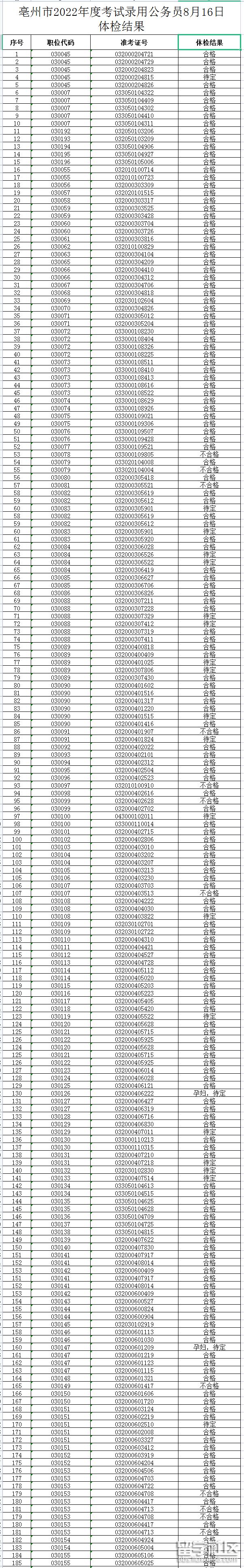 亳州市2022年度考試錄用公務員8月16日體檢結果公示
