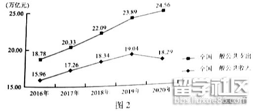 13.圖2是我國2016~2020年全國一般公共收入與支出變化走勢。