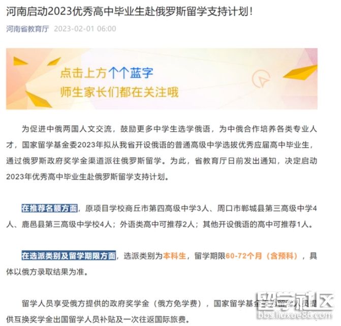 2月1日,河南省教育廳官方公眾號發(fā)布《河南啟動2023優(yōu)秀高中畢業(yè)生赴俄羅斯留學支持計劃》。