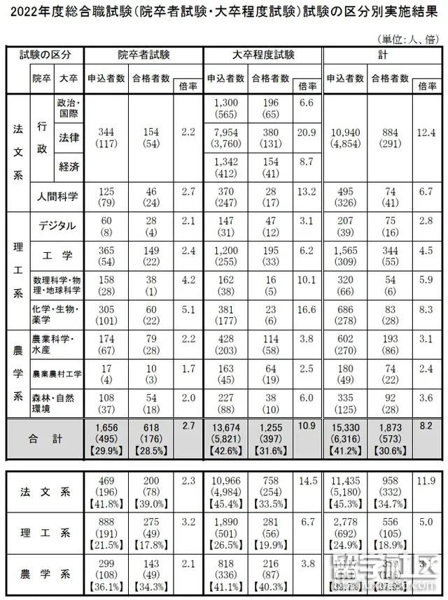 2022年,全國(guó)公務(wù)員綜合職考試報(bào)考研究生共618人,大學(xué)1255人,共計(jì)1873人。倍率方面,大學(xué)院考試為2.7倍(上一年是2.5倍),大學(xué)生考試的10.9倍(上一年的10.5倍),平均8.2倍(上一年的7.8倍)。