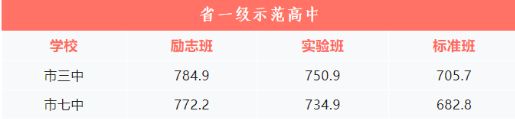 根據(jù)相關規(guī)定,省一級示范性高中(市三中、市七中)錄取分數(shù)線出爐。其中,市三中勵志班分數(shù)線是784.9分、實驗班750.9分、標準班705.7分;市七中勵志班分數(shù)線是772.2分、實驗班734.9分、標準班682.8分。