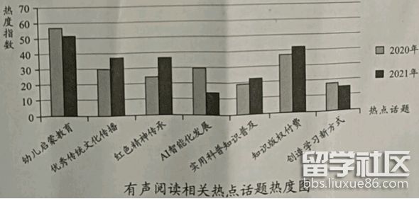 材料三 截至2021年12月31日,微信公眾平臺(tái)有聲閱讀發(fā)文量達(dá)230萬篇,相關(guān)文章的閱讀量已達(dá)21.9億次,有聲閱讀的熱點(diǎn)話題熱度也不斷變化(如下圖所示)。有聲閱讀氛圍越來越濃,閱讀率越來越高。作為全民閱讀的重要組成部分,有聲閱讀豐富了閱讀內(nèi)容和形式,促進(jìn)了社會(huì)閱讀文明的發(fā)展。