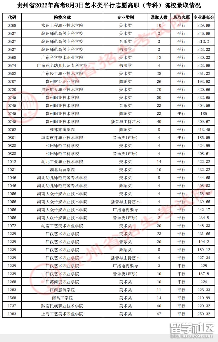 8月3日,貴州省教育考試院公布了貴州省2022年藝術(shù)類平行志愿??茖W(xué)院錄取情況,詳細(xì)錄取情況表如下,感興趣的來看看這篇文章吧!下面是出國留學(xué)網(wǎng)整理的貴州2022年高考??扑囆g(shù)類平行志愿錄取情況,歡迎大家參考閱讀。