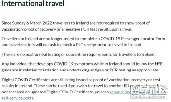 抵達(dá)愛(ài)爾蘭時(shí)不需要出示新冠疫苗接種證明,康復(fù)證明或 PCR 核酸檢測(cè)陰性證明。也無(wú)需進(jìn)行核酸檢測(cè),沒(méi)有隔離要求。