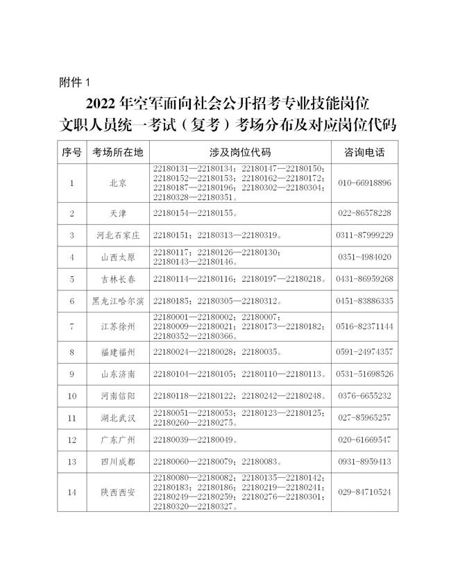 經(jīng)研究,北京等14個考區(qū)2022年空軍面向社會公開招考專業(yè)技能崗位文職人員統(tǒng)一考試定于2023年1月8日(周日)下午14時至16時復(fù)考。
