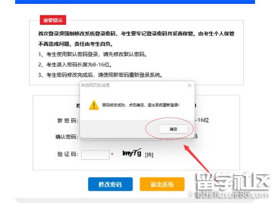 4、密碼修改成功。(請考生高度重視登錄密碼的保管,此密碼將用于后期登錄系統(tǒng)進行成績查詢,準考證下載,志愿填報等事項,不要將密碼告訴他人,以防被他人篡改志愿等信息。)