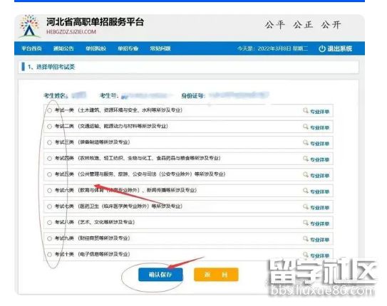 7、選擇考試類別。統(tǒng)考生可以從考試一類到十類里面選擇一個。對口生可以從默認對口類、一類到十類里面選擇一個。本文以有學考的統(tǒng)考生為例。用考試七類舉例。