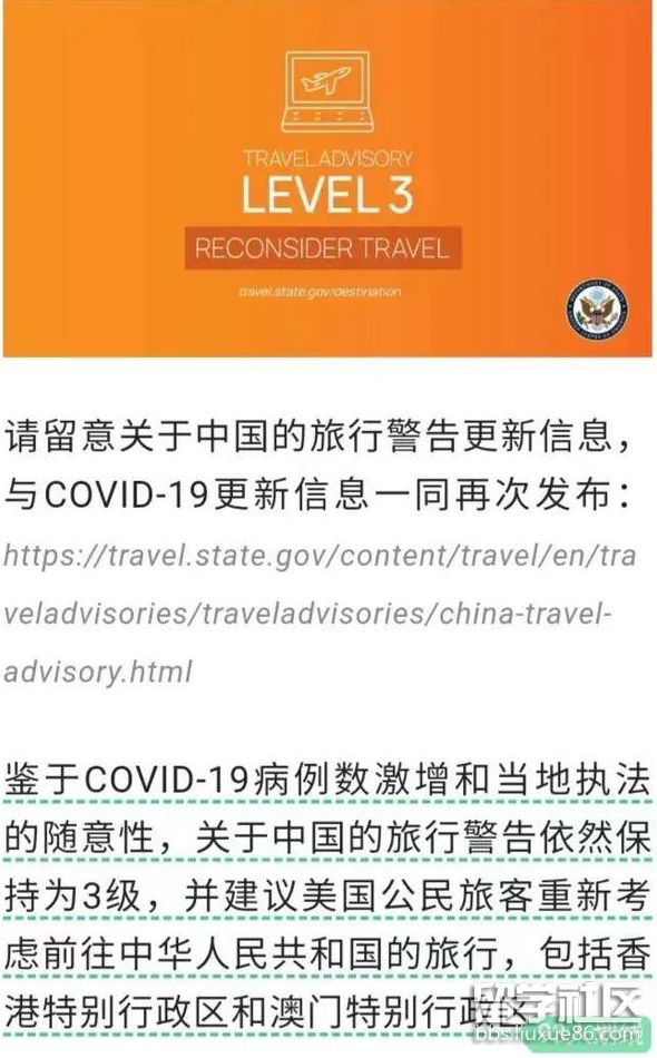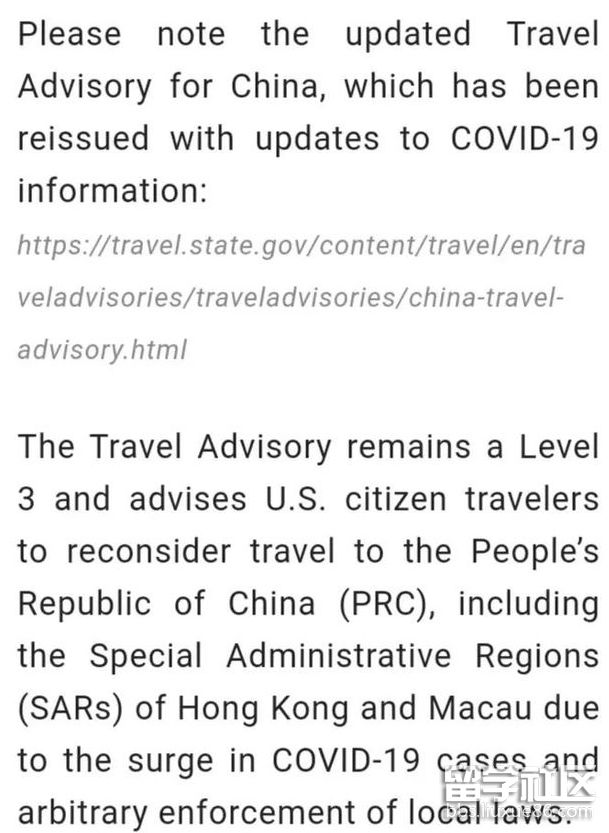 美國(guó)國(guó)務(wù)院近日也重新發(fā)布有關(guān)去中國(guó)的旅行警告和COVID-19更新信息:中國(guó)的旅行警告依然保持為3級(jí),并建議美國(guó)公民旅客重新考慮前往中國(guó)的旅行,包括香港特別行政區(qū)和澳門(mén)特別行政區(qū)。