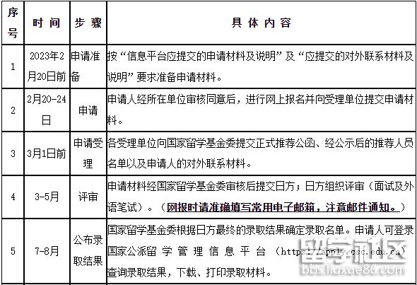 申請人經(jīng)所在單位審核同意后,按“信息平臺應提交的申請材料及說明”及“應提交的對外聯(lián)系材料及說明”要求準備申請材料,于2023年2月20-24日間登錄國家公派留學管理信息平臺() 進行網(wǎng)上報名,并向國家留學基金申請受理單位(以下簡稱受理單位)提交申請材料。
