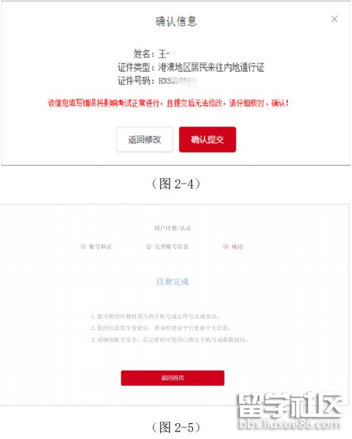 4. 全部填寫完成,點(diǎn)擊“提交”按鈕后,系統(tǒng)將會彈框提醒再次確認(rèn)所填信 息,如下圖(2-4),點(diǎn)擊“返回修改”可返回到信息填寫頁面修改,點(diǎn)擊“確認(rèn) 提交”后將出現(xiàn)注冊成功提示,如下圖(2-5):