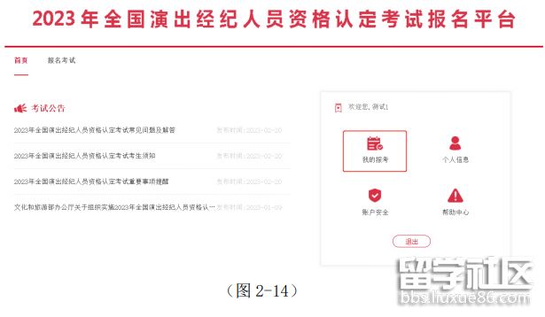 1.考生進(jìn)入 2023 年全國演出經(jīng)紀(jì)人員資格認(rèn)定考試報名平臺,系統(tǒng)首頁如下圖(2-1):