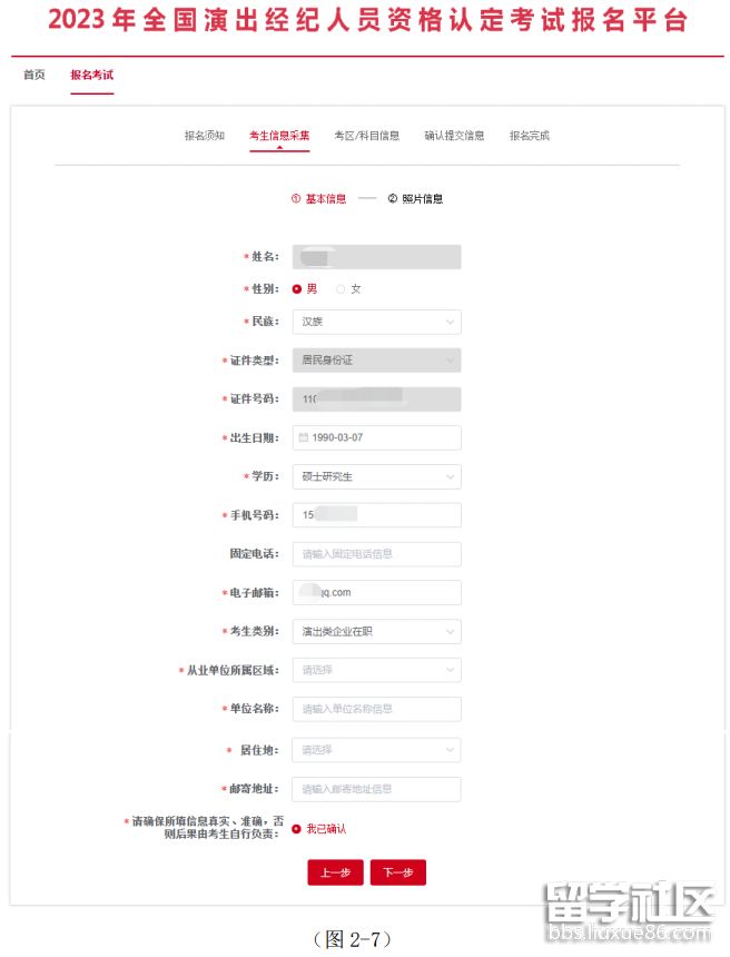 7.考生需完善基本信息、通訊信息、教育信息等,請注意查看各項(xiàng)填寫提示, 如實(shí)、準(zhǔn)確填寫相關(guān)信息。全部填寫完畢后,點(diǎn)擊“下一步”按鈕,會進(jìn)入手機(jī) 驗(yàn)證頁面,請在輸入圖形驗(yàn)證碼后,點(diǎn)擊“獲取驗(yàn)證碼”,然后將手機(jī)號上收到 的驗(yàn)證碼輸入,點(diǎn)擊“確認(rèn)”按鈕后,即完成手機(jī)驗(yàn)證。如下圖(2-8):