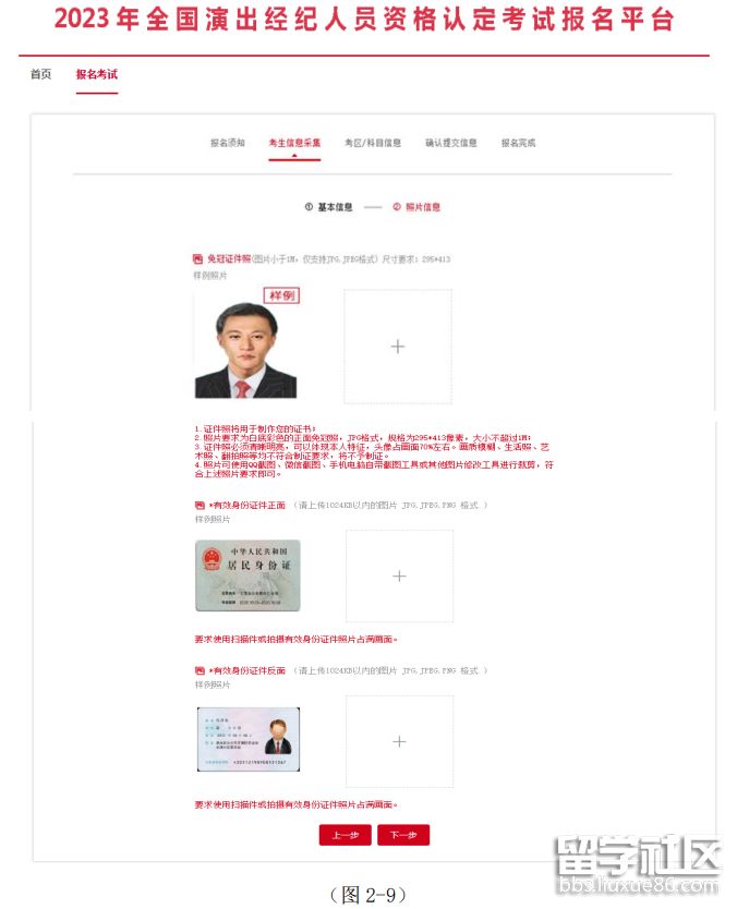 8.手機(jī)驗(yàn)證完畢后,系統(tǒng)將進(jìn)入資料上傳界面,每類上傳資料均有格式要求 及相關(guān)說明,請考生仔細(xì)閱讀紅字提醒,并在報考前仔細(xì)閱讀相關(guān)考試公告,提 前準(zhǔn)備好上傳資料,如下圖(2-9):