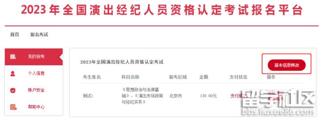 考生可在考試報名期間,在報名平臺首頁點(diǎn)擊“我的報考”,然后點(diǎn)擊頁面 的“基本信息修改”按鈕進(jìn)行個人信息修改,修改后點(diǎn)擊保存完成修改。