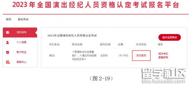 交費(fèi)成功后,考生可以在“首頁”-“我的報考”里查看支付狀態(tài),支付成 功即為報名成功,如下圖(2-19)所示: