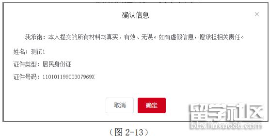 11.考生在核對信息無誤后,點(diǎn)擊“提交”按鈕,在下圖(2-13)中承諾上傳 的所有資料均真實(shí)有效,如有虛假需承擔(dān)一切責(zé)任。