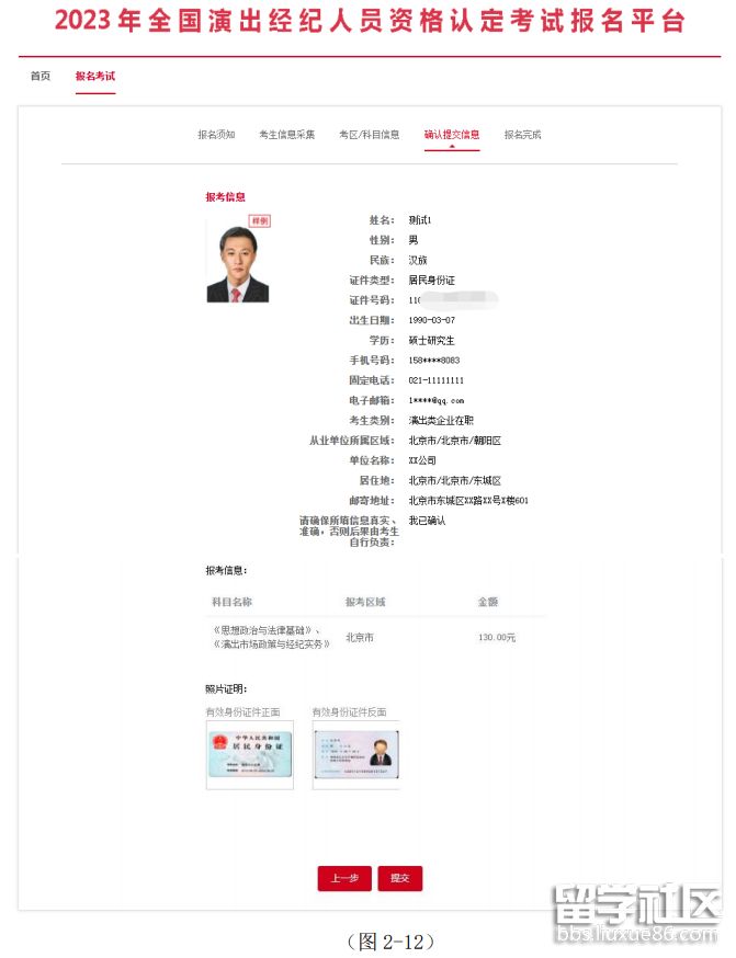 10. 在確認(rèn)完科目后,點(diǎn)擊“下一步”按鈕,進(jìn)入報考信息確認(rèn)界面,如下 圖(2-12):