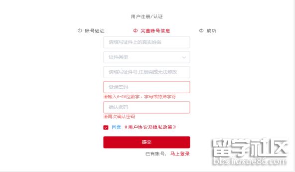 (2)注冊賬號時,請準(zhǔn)確、如實(shí)填寫姓名、證件類型和證件號碼三類信息, 注冊成功后,該字段將直接帶入報考信息,且無法修改。