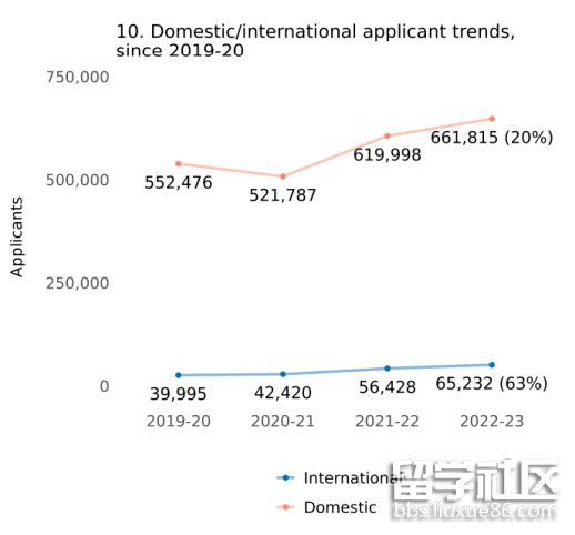 2022-2023申請季提交早申的學(xué)生中,無論是美國本土學(xué)生還是國際生,均迎來上漲。提交早申的美國本土學(xué)生多達(dá)661,815人,比2019-2020申請季上漲了20%;提交早申的國際生多達(dá)65,232人,比2019-2020申請季上漲了63%。