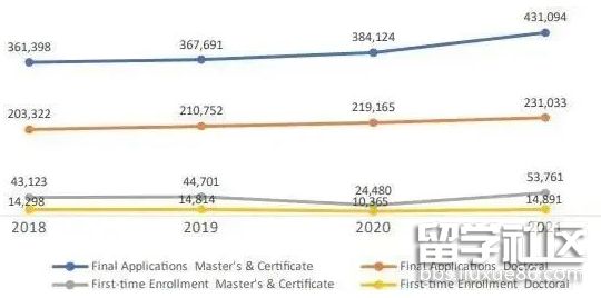 2020-21學(xué)年,美國大學(xué)總共收到了852,006份國際研究生申請,其中中國申請人占據(jù)的比例為35%,印度申請人所占比例為31%。