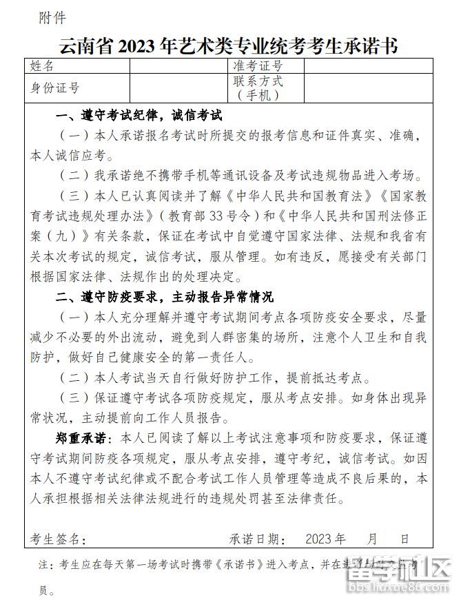 云南2023年藝術(shù)類專業(yè)統(tǒng)考考生承諾書