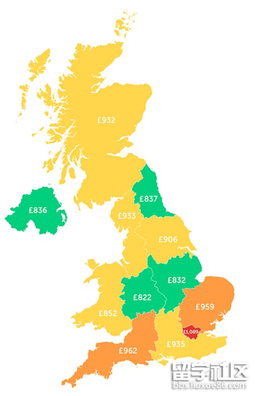 如上圖所示,英國學(xué)生生活成本最高的地方位于英格蘭南部和東部。倫敦是迄今為止最昂貴的地區(qū),每月比該國任何其他地區(qū)貴100多英鎊。這在一定程度上要歸功于倫敦的房租成本。在英國的另一端,生活開銷也不便宜貴。蘇格蘭的生活費用與學(xué)生在英格蘭東南部支付的費用相差不遠(yuǎn),英格蘭東南部是另一個眾所周知的昂貴居住地。相比之下,北愛爾蘭、中部地區(qū)和英格蘭東北部則是英國生活成本較低的地區(qū)。