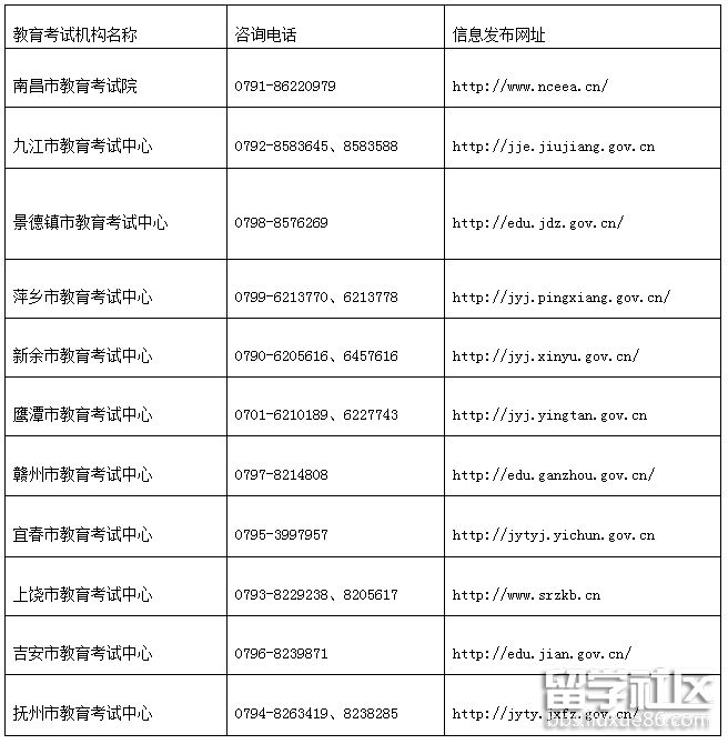 江西省各設(shè)區(qū)市教育考試機(jī)構(gòu)聯(lián)系電話及信息發(fā)布網(wǎng)址