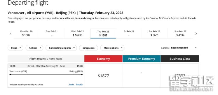 加拿大航空官網(wǎng)顯示,2月溫哥華直飛北京的單程最低票價為1877加元。