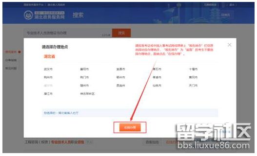 1.請考生進(jìn)入湖北政務(wù)服務(wù)網(wǎng)(zwfw.hubei.gov.cn),注冊成功并登陸;在湖北政務(wù)服務(wù)網(wǎng)首頁,按考生準(zhǔn)考證或中國人事考試網(wǎng)成績單上“報名地市”一欄顯示的信息選擇相應(yīng)辦理地點(diǎn),其中“報名地市”一欄信息顯示為“省直”的考生無需選擇辦理地點(diǎn)(保持頁面默認(rèn)狀態(tài)即可),直接在搜索欄輸入“專業(yè)技術(shù)人員資格證書辦理”后點(diǎn)擊“搜索”。