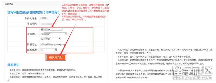 8.選擇送達(dá)地區(qū)所在省市區(qū),并填寫詳細(xì)地址(如道路、門牌號、小區(qū)、樓棟號、單元室等),系統(tǒng)會自動計算出郵寄費(fèi)用,具體收費(fèi)標(biāo)準(zhǔn)見界面下方“郵寄須知”;請在確認(rèn)地址無誤,并對郵寄費(fèi)用數(shù)額無異議后,點(diǎn)擊“確認(rèn)并支付”。