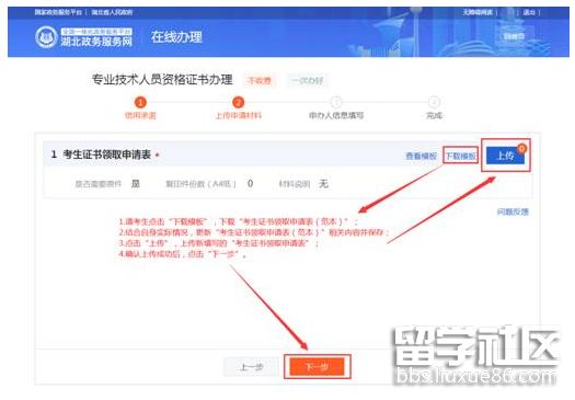 5.請在“下載模板”欄下載“考生證書領(lǐng)取申請表(范本)”;結(jié)合自身實(shí)際情況,更新“考生證書領(lǐng)取申請表(范本)”中相關(guān)內(nèi)容并保存;點(diǎn)擊“上傳”,上傳新填寫的“考生證書領(lǐng)取申請表”;確認(rèn)上傳成功后,點(diǎn)擊“下一步”。