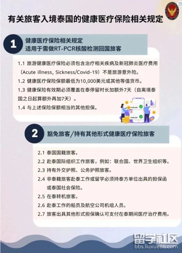 2.若始發(fā)國(如中國)在入境時(shí)要求出示核酸檢測陰性證明,需要購買保額10,000美元以上且涵蓋新冠治療費(fèi)用并覆蓋在泰停留時(shí)長+7天的醫(yī)療保險(xiǎn),如2.1入境,2.15離泰,那么需要購買15+7=22天保險(xiǎn);